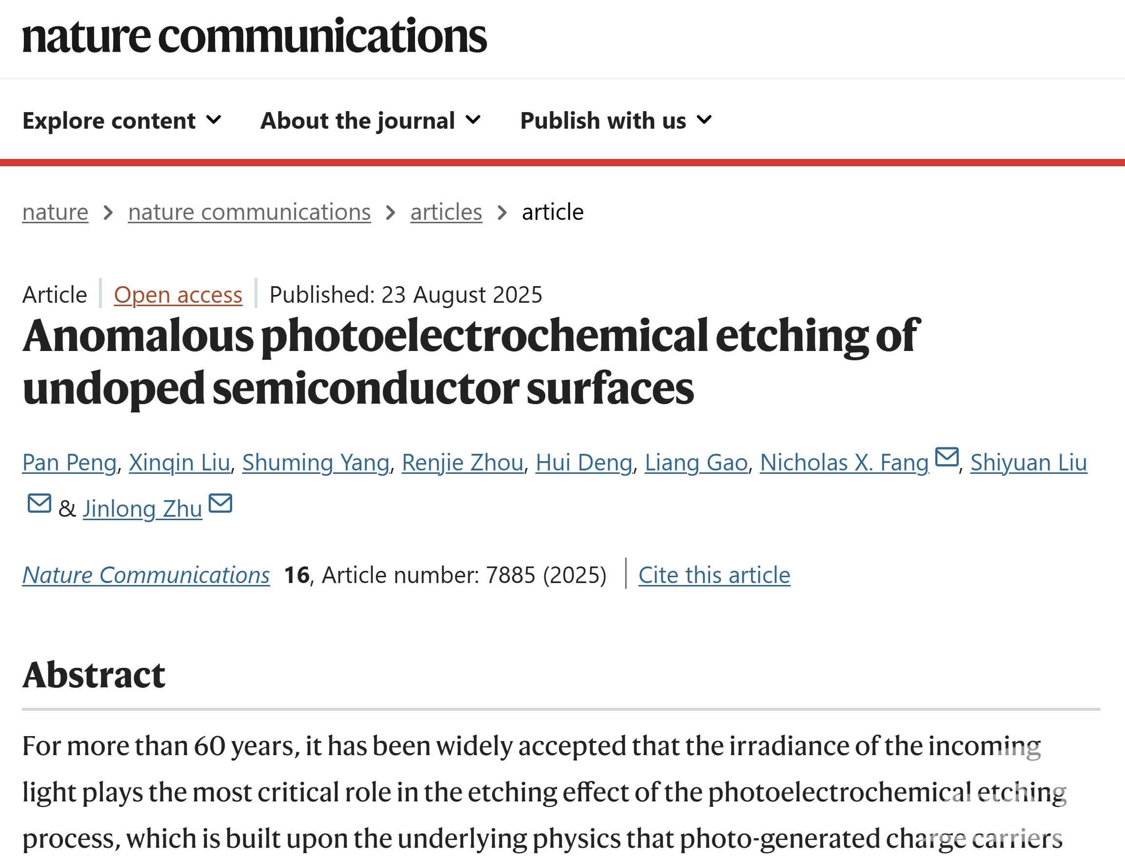 新闻网讯 8月23日,机械学院朱金龙教授课题组、刘世元教授课题组、高亮教授课题组组成的联合研究团队,在Nature Communications上发表成果 “无掺杂半导体表面的反常光电化学刻蚀效应”(Anomalous photoelectrochemical etching of undoped semiconductor surfaces)。这是在国际上首次发现反常光电化学刻蚀效应。机械学院2024级博士生彭攀为第一作者,机械电子信息工程系教授朱金龙为通讯作者。