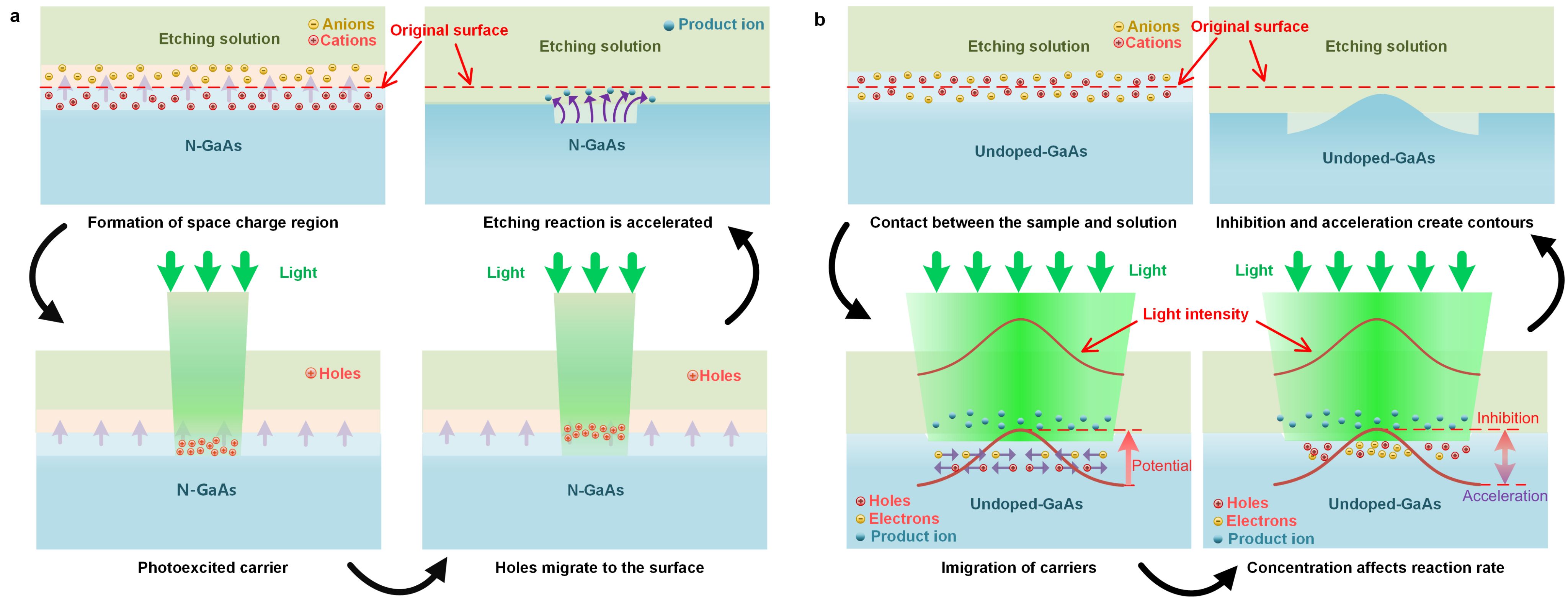 在过去的数十年里,半导体的光电化学刻蚀效应一直被认为是光生载流子在半导体与电解质溶液接触表面形成的内建电场作用下迁移到样品表面参与并催化电化学刻蚀导致的结果。本研究报道了一种反常的物理现象,即在光电化学刻蚀过程中,具有横向(平行于半导体表面)梯度的空间光场照明能够诱导无掺杂半导体表面的光生载流子产生横向迁移,载流子浓度的重新分布导致在无掺杂半导体中产生了与常规光电化学刻蚀相反的刻蚀结果。实验结果表明光照强度与梯度、载流子扩散长度等因素与该过程密切相关。