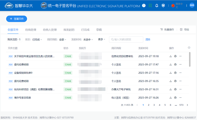 学校电子签名平台(https://esign.hust.edu.cn)聚焦构建智慧校园可信数字认证体系,为师生提供安全可靠的线上签名服务。以往成绩单开具、证明办理、内部审批等均需线下签字盖章的业务,如今线上即可完成,践行了“让数据多跑路,让师生少跑腿”理念。目前,平台已助力11个业务部门上线18类可信应用(如财务电子签名审批、采购电子合同等),累计服务师生超37万次,大幅提升师生办事效率与服务质量,推动智慧校园建设进入新阶段。