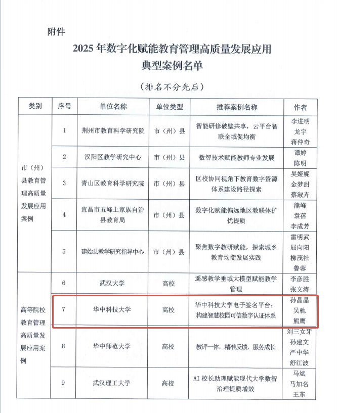 新闻网讯(通讯员 孙晶晶)10月20日,湖北省教育信息化发展中心、湖北省电化教育馆公布了2025年数字化赋能教育管理高质量发展应用典型案例评选结果,我校报送的《rabey雷竞技电子签名平台:构建智慧校园可信数字认证体系》成功入选。