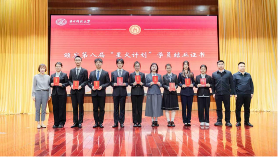 活动现场,学工部、组织部、宣传部、校团委相关负责人分别为第八届“星火计划”优秀学员代表、“鸿鹄计划”学员代表颁发结业证书,为第九届“星火计划”的指导老师代表颁发聘书。