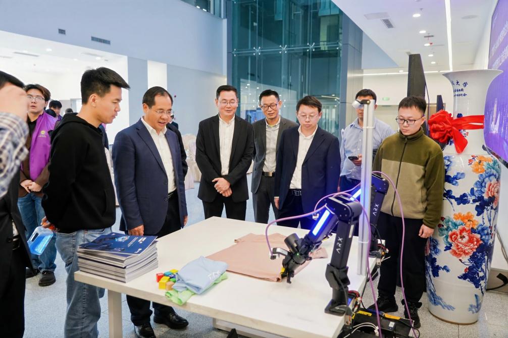 戴则健、吴周俊、自控956班代表王卓、匿名校友代表周纯杰、耿远明、学院院长曾志刚共同启幕捐赠墙。承载着校友深情的八块捐赠牌依次完成揭牌。捐赠签约环节,擎朗机器人将签约文件送至台前,曾志刚代表学院分别与吴周俊、周纯杰、北京志诚泰和信息科技有限公司董事长付文校友、万境千寻(北京)科技有限公司CEO韩峰涛校友完成四笔捐赠签约。随后,千寻机器人亮相,展现了校友企业的前沿科技成果。曾志刚作专题报告,回顾了学院取得的发展成果,介绍了新大楼的使用规划。