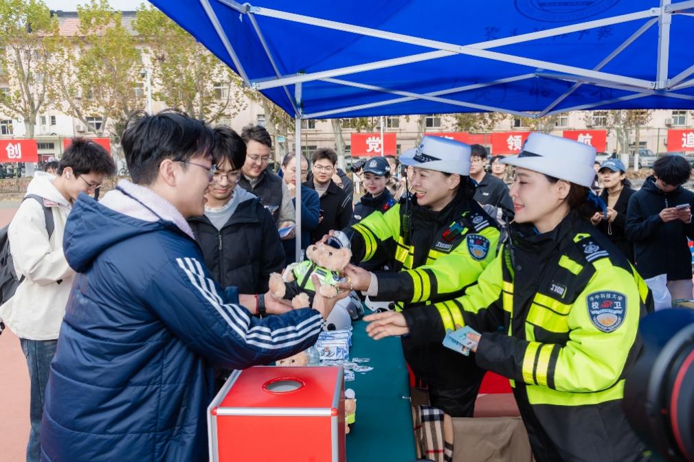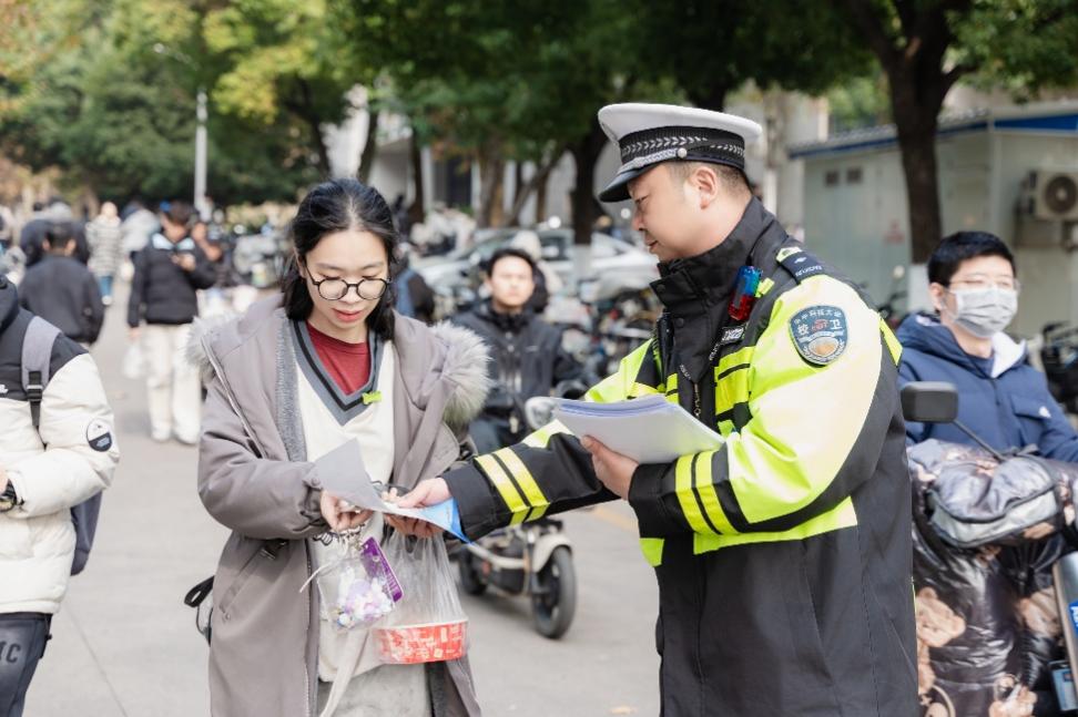 保卫处工作人员和交警为师生发放精心制作的宣传单页,普及交通安全知识,强调遵守交通规则的重要性。