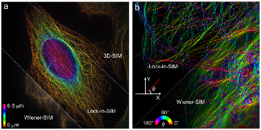图2:锁相SIM实现了基于2D图像获取的3D层切重构(a)及更高精度的图像定量信息提取(b)