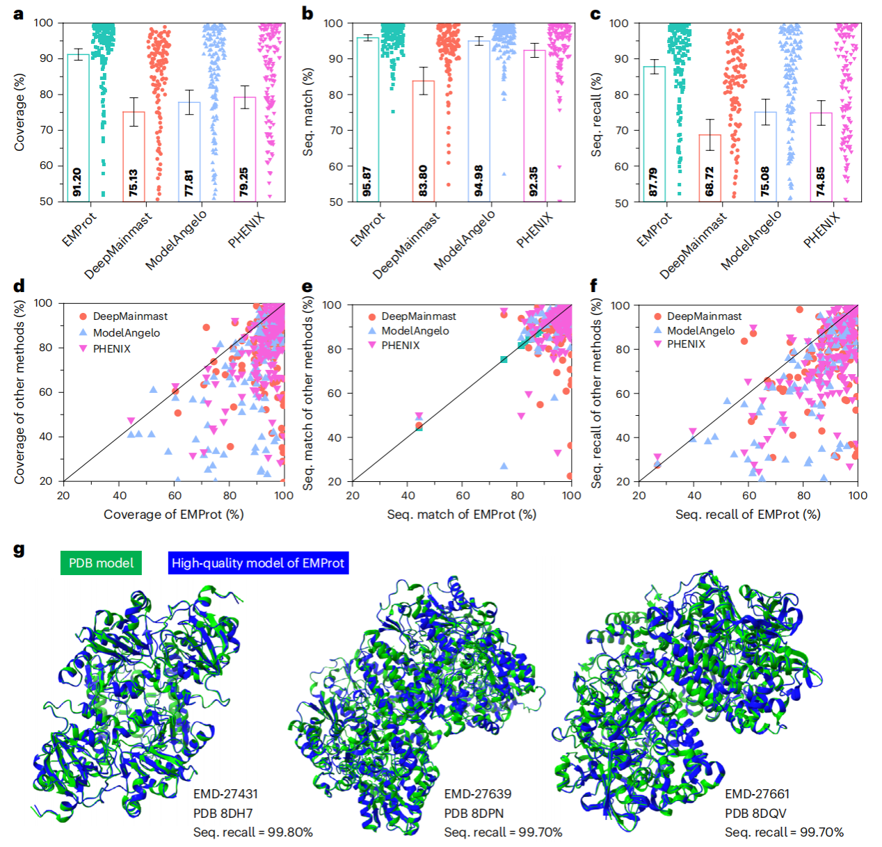 图2:EMProt在建模完整性、序列匹配度、序列召回率等方面均优于同类方法,其精度可与手动建模的PDB结构相比拟