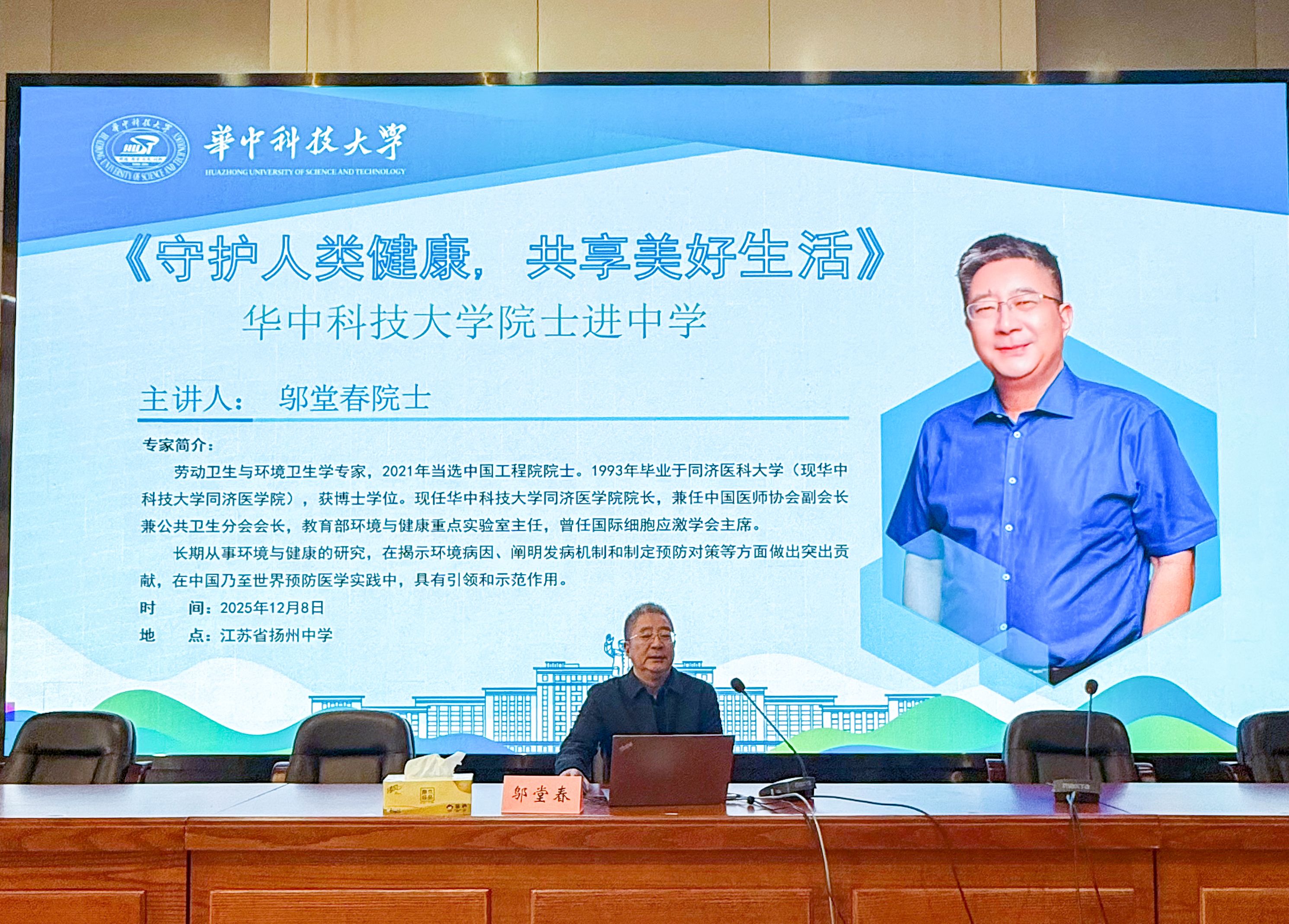 新闻网讯(通讯员 王英杰)12月8日,中国工程院院士、同济医学院院长邬堂春走进江苏省扬州中学,以“守护人类健康,共享美好生活”为题,为学生带来一场兼具科学深度与实践温度的科普讲座。