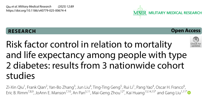 新闻网讯 近期,Military Medical Research发表公卫学院刘刚教授的联合研究成果“Risk factor control in relation to mortality and life expectancy among people with type 2 diabetes: results from 3 nationwide cohort studies”。该研究基于中国全国代表性人群以及英国和美国的3个全国性队列,发现“多病因共防”能够显著延长2型糖尿病患者的预期寿命6~9年,但不同患者的获益存在差异。另外,相较于临床代谢指标控制,生活方式因素的达标管理对糖尿病患者预期寿命的贡献更大。研究表明,传统“一刀切”的防控策略忽略了糖尿病患者的个体差异,需要结合不同表型制定差异化方案,同时重视生活方式管理,才能实现更加精准和高效的糖尿病防控。