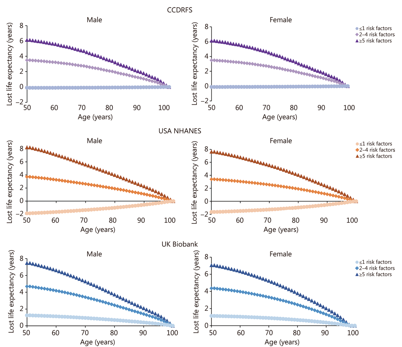 图1.糖尿病患者危险因素控制未达标情况对应的预期寿命损失(与非糖尿病组比较)