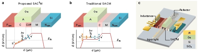 为解决这一难题,研究团队通过分离吸收-电荷-峭壁-倍增结构,实现了以电子为主导的单载流子倍增过程。器件的原理和结构示意图如图1所示。传统APD在锗区具有均匀的电场,电子和空穴同等程度地倍增。在提出的新型结构中,由于峭壁层(cliff)的特殊作用,电子在高场区加速并产生碰撞电离,空穴则进入低场区被抑制倍增,从而显著提高了APD的带宽。