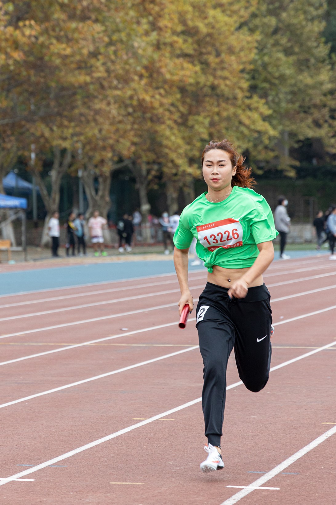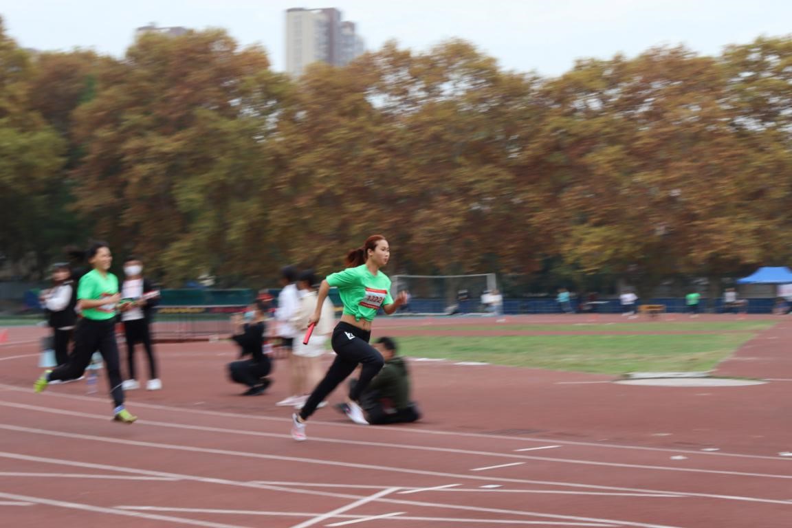 同时,魏妹也是公管学院本科女乙四乘一百米决赛队伍的一名成员。身穿统一的绿色队服,魏妹作为最后一棒,与队友娴熟配合。魏妹所在的队伍最终以几乎领先第二名一百米的距离夺冠,现场观众掌声雷鸣。
