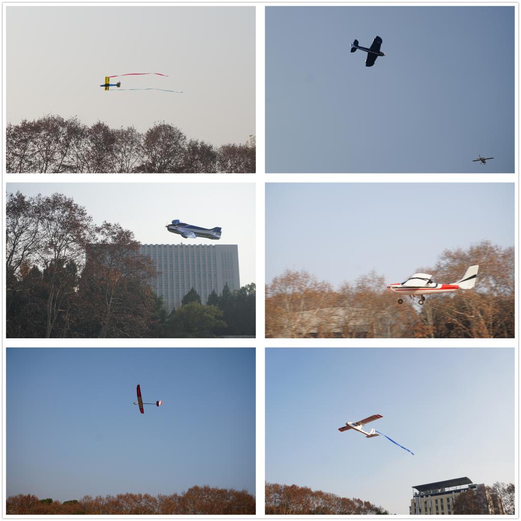 2020年飞行实践表演是航空航天学院大学生创新实践基地首场活动。来自思飞工作室、武汉工程大学航模社、WUT航模协会、武昌区南湖航空航天科技馆的飞手同学和老师带来了一场精彩绝伦的飞行表演。塞斯纳、3D纸飞机“落叶飘”如芭蕾舞般在空中交织旋转,蓝天精灵电动滑翔机在晴空下绘出优美轨迹,旋翼无人机化身“空中猎豹”开展极速追逐,直升机“钟摆”“贴地剪草”等花式特技令人血脉喷张。发射、悬停、翻转、倒飞、滑翔……,航模飞手空中炫技,精彩刺激的表演引来观众们阵阵喝彩。