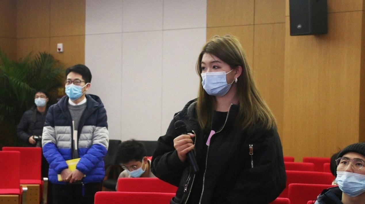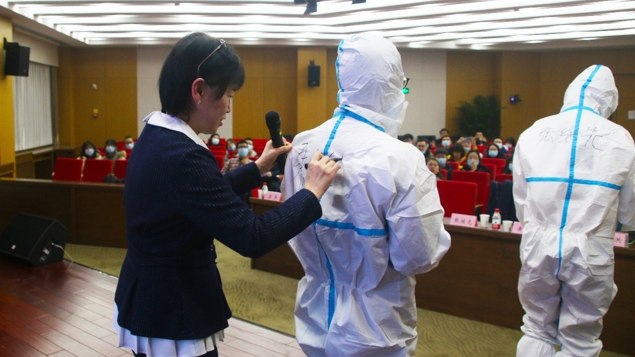 讲座伊始,张继先邀请两位同学上台体验防护服,并梳理武汉疫情爆发的整体时间线和关键的时间点,带领现场师生回顾了疫情爆发的整个过程。