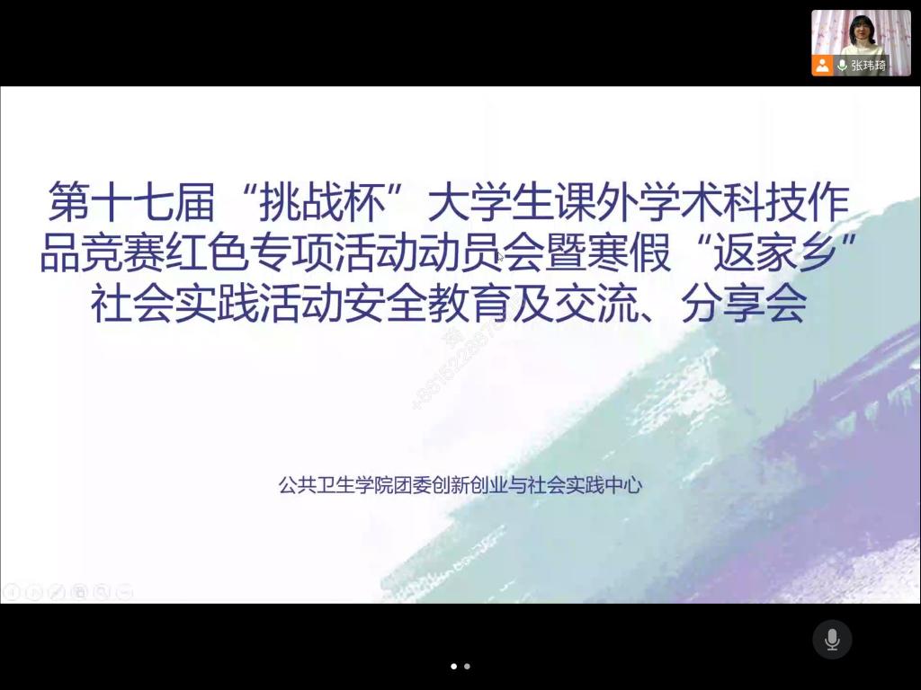新闻网讯(通讯员 陈琦)2月1日,公共卫生学院创新创业与实践中心举办了第十七届“挑战杯”大学生课外学术科技作品竞赛红色专项活动动员会暨寒假“返家乡”社会实践活动安全教育及交流、分享会线上会议。
