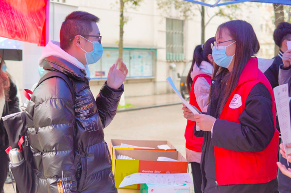 中午时分,空中雨滴散落但并未浇灭志愿者们的工作热情,他们一手抱着宣传册、一手撑着雨伞,耐心仔细地向同学们介绍着常态化疫情防控的知识。