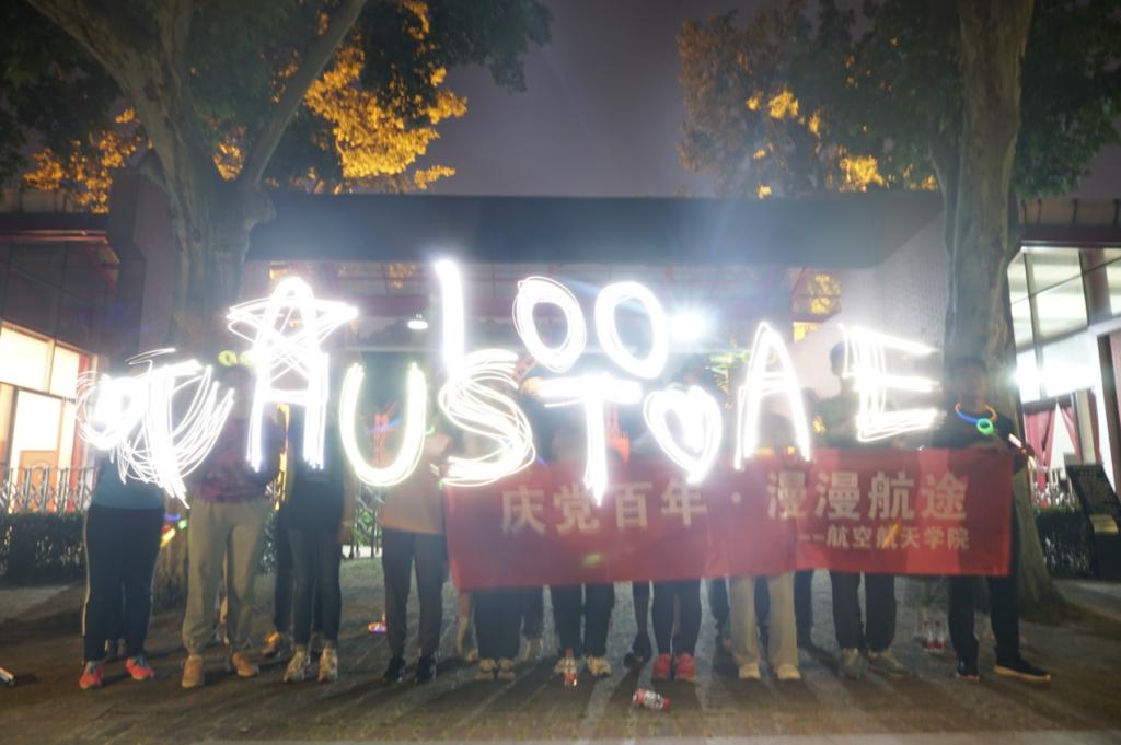 新闻网讯(通讯员 薛茜茜)“航空航天学院,庆党百年,漫漫航途,成功!”5月8日晚,校史馆前,响亮的口号声回荡在夜空中,航空航天学院30余名学子用荧光绘出党徽和百年数字,共同为党的百年华诞庆祝增彩。