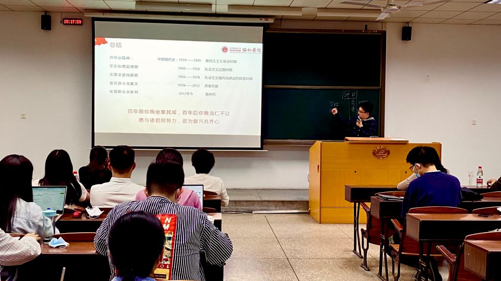 校青年马克思主义培养班学员、2016级临床医学五年制吴志杰分享的主题是“红船劈波行,精神暖人心”。他从红船精神的时代背景、精神内涵、现实意义展开介绍,将其蕴含的“开天辟地、敢为人先的首创精神,坚定理想、百折不挠的奋斗精神,立党为公、忠诚为民的奉献精神”娓娓道来,并结合自身实践的经历畅谈自己对红船精神的感悟与心得。吴志杰谈到,坐而论道,更要起而行之,我们在学习党史的过程中不仅要读原著、学原文,更要在亲身实践中悟原理,要带着信念学、带着感情学、带着使命学。
