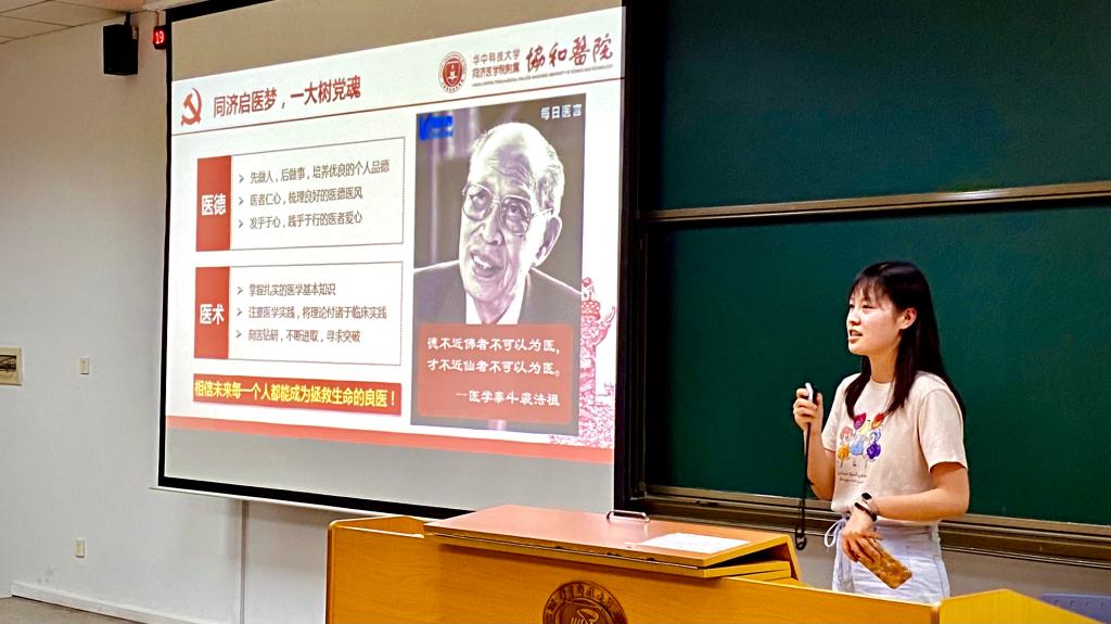 学院团委学生兼职副书记、2016级临床医学八年制邓悦结合此前参加医学学工处组织的红色寻访经历,带来了“从石库门到天安门,从兴业路到复兴路”主题分享。她从中共一大的召开背景、会址选择以及会议议程等方面带领大家回顾了那段峥嵘岁月。邓悦谈到了重走一大路的感悟与体会,并以“同济启医梦,一大树党魂”分享了她对医德、医术的理解:先做人、后做事,培养优良的个人品德;医者仁心,树立良好的医德医风;发乎于心、践乎于行的医者爱心;同时还要有扎实的医学基础知识,刻苦钻研、不断进取、需求突破。