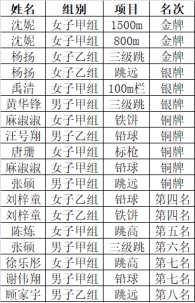 湖北代表团大学甲、乙组田径项目中,我校19名学子在余长青、李景丽、张克堃、龚秀春、卢标等教练组的带领下,自田径开赛第二日起便喜讯连连,沈妮获女子甲组1500m和800m冠军、杨扬获女子乙组三级跳远冠军和跳远亚军、禹清获女子甲组100米栏亚军、黄华锋获男子甲组三级跳远亚军、麻淑淑获甲组铁饼和铅球季军、唐珊获女子甲组标枪季军、张硕获男子甲组跳远季军、王号翔获男子乙组铅球季军。