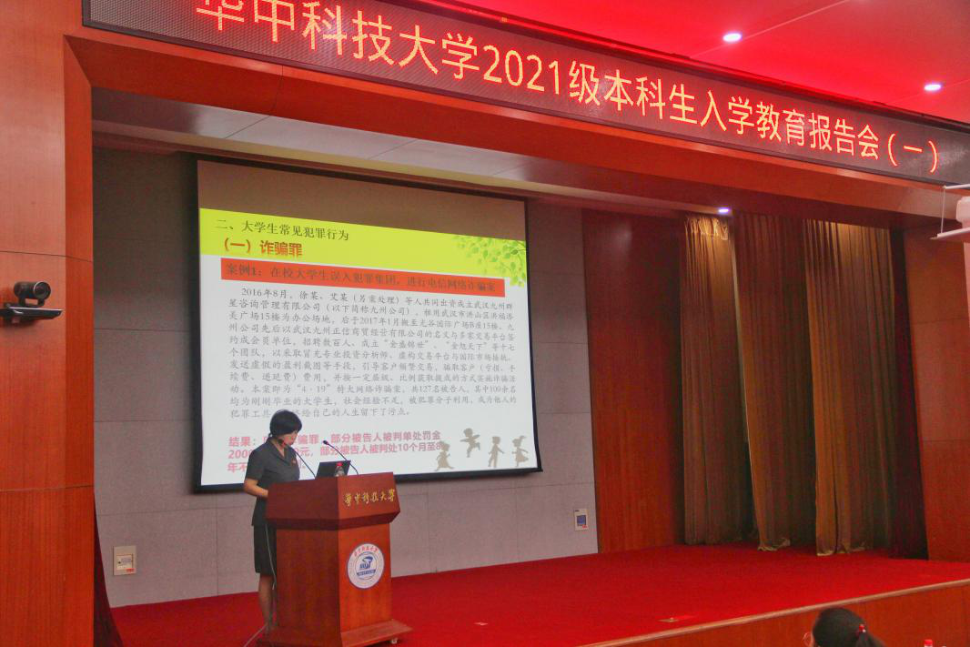 肖玉华为同学们作法制安全报告。她援引近几年数据,指出青少年犯罪数量和涉及的类型不断增长,开展大学生法制教育极其重要和迫切。她从1800余件案件中筛选出6个典型案例,系统阐释了诈骗罪、寻衅滋事罪、帮助信息网络犯罪活动罪等青少年常见犯罪行为的具体内容,并强调组织考试作弊,非法出售、提供试题和答案以及代替考试也是违法犯罪行为。报告中,肖庭长还详细分析了大学生实施犯罪行为的原因,提醒新生们要提高法律意识与自我防护意识,树立正确的人生观、价值观、金钱观、恋爱观,保持清醒的头脑。