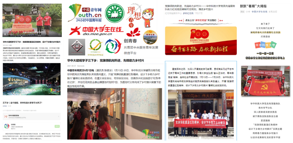 服务队的事迹受到了团中央官方网站中国青年网、教育部主导并推动的“中国大学生在线”微信公众号报道和地方各级宣传平台的推送总计20余篇报道,并荣登raybet雷竞技ios下载宣传平台、创青春官微,集中展现了我院社会实践团队深入乡村、扎根乡村、服务乡村的青春作为。