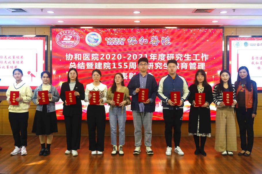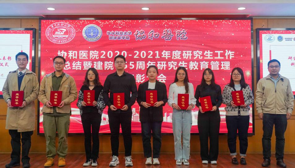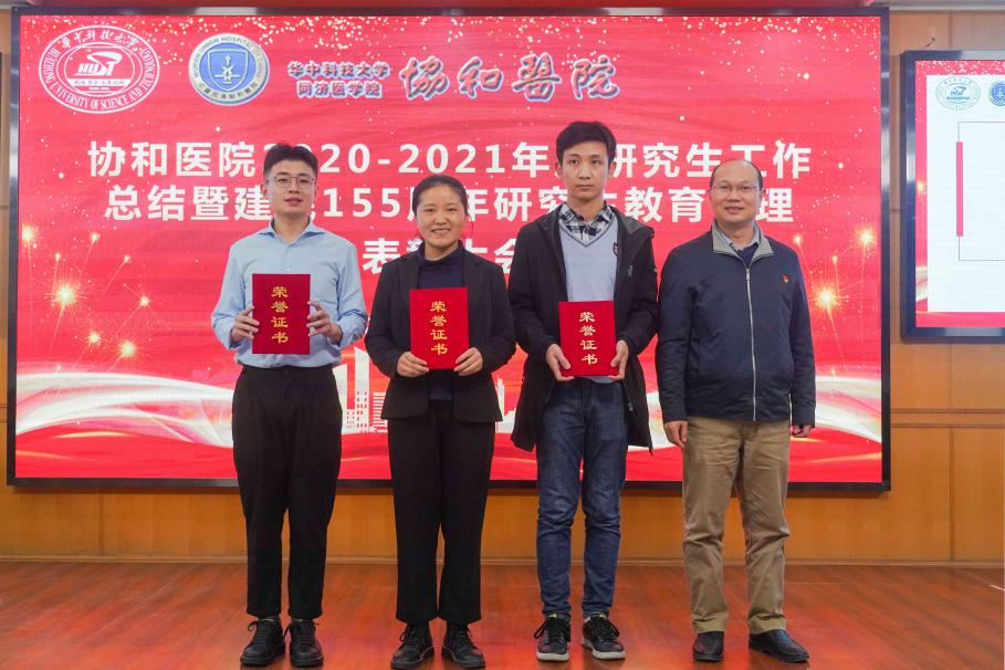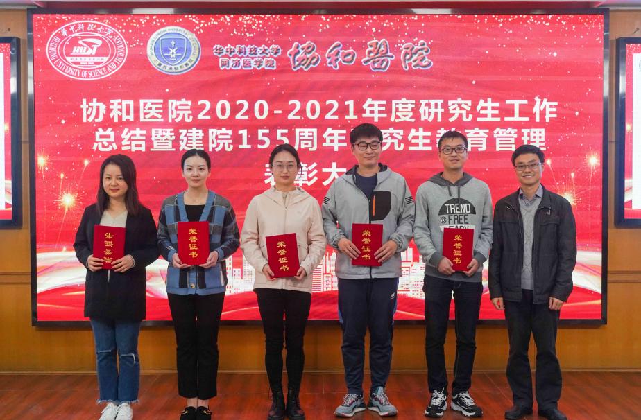 协和医院党委办公室主任袁柏春和协和医院党委组织部部长龙洪波为2020-2021年度研究生七一表彰评选先进集体和个人、研究生党校优秀学员颁奖。协和医院党委宣传部部长王继亮为2020-2021年度研究生创新创业先进集体和个人颁奖。协和医院团委书记张方方为2020-2021年度研究生五四评优、校“百生讲坛”活力团支部、研究生会优秀成员颁奖。协和医院研究生党委书记梅恒主持会议,并为2020-2021年度研究生优秀社会实践团队和科普大赛获奖人员颁奖。协和医院研究生党委副书记欧阳真为2020-2021年度研究生文体竞赛获奖人员颁奖。
