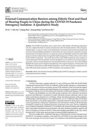 新闻网讯(通讯员 鄢楚)11月2日,国际知名SSCI & SCI双检索期刊International Journal of Environmental Research and Public Health发表了新闻学院“突发公共卫生事件中听障人士对外沟通方式优化研究”国家级大学生创新创业项目团队在健康传播领域的最新研究成果(Xu, D.; Yan, C.; Zhao, Z.; Weng, J.; Ma, S. External Communication Barriers among Elderly Deaf and Hard of Hearing People in China during the COVID-19 Pandemic Emergency Isolation: A Qualitative Study.Int. J. Environ. Res. Public Health2021, 18, 11519.)。