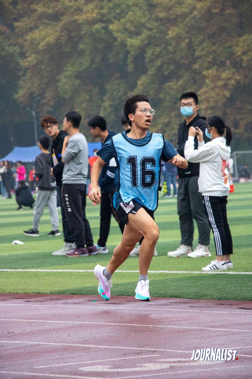 最先开始的是本科男子甲组比赛。枪响、起跑、加速,身着16号蓝色赛服的赖贞兵很快就占据了领先位置。开始时他只领先了3个身位,但随着圈数的增加,他从容地改变速度、调整呼吸,第三圈时,他已取得了巨大的优势,远远地将对手甩在身后。随着他大步冲过终点线,围观的志愿者与观众由衷地献上掌声。
