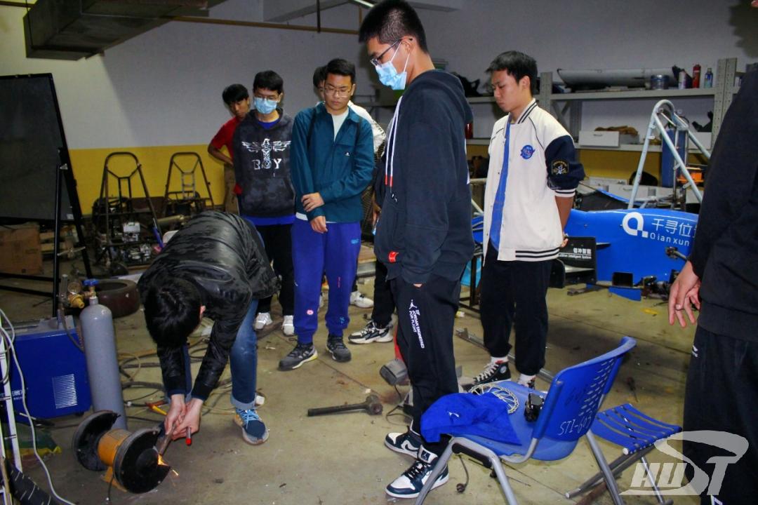 在地下室工作车间目前可见的赛车框架上,副队长重点介绍了车队的主要制造工艺和流程——一个个小小的零部件是如何变成面前这一个“庞然大物”的?田劭坤向大家现场演示了车队使用的碳纤维板制作和氩弧焊技术。演示的同时还为大家介绍了角磨机、手钻、砂轮机等一些常用的钳工工具。