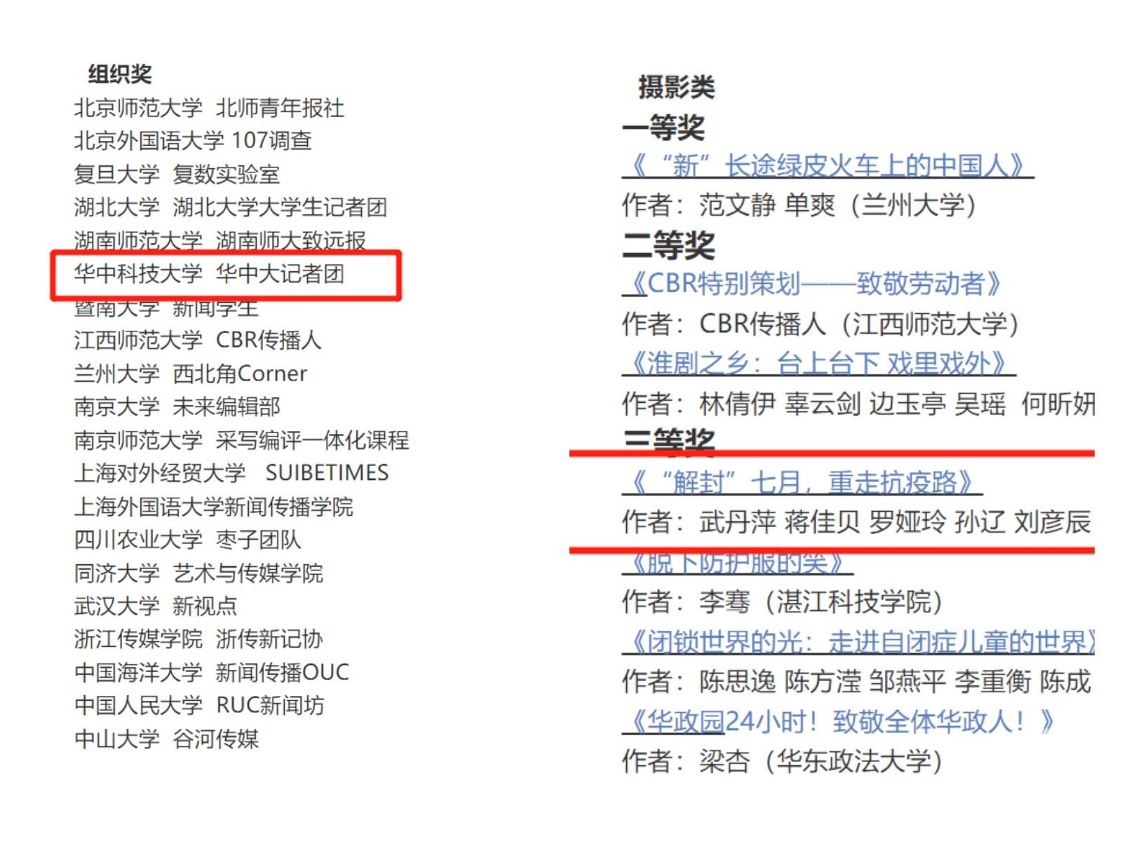 新闻网讯 10月16日,第三届大学生校园媒体大赛颁奖典礼在上海举行,华中大记者团在本次大赛中获得两项荣誉。记者武丹萍、蒋佳贝、罗娅玲、孙辽、刘彦辰、张琪、王珂雅、温馨瑶和陈星宇的作品《“解封”七月,重走抗疫路》获得摄影类三等奖。华中大记者团荣获获组织奖。