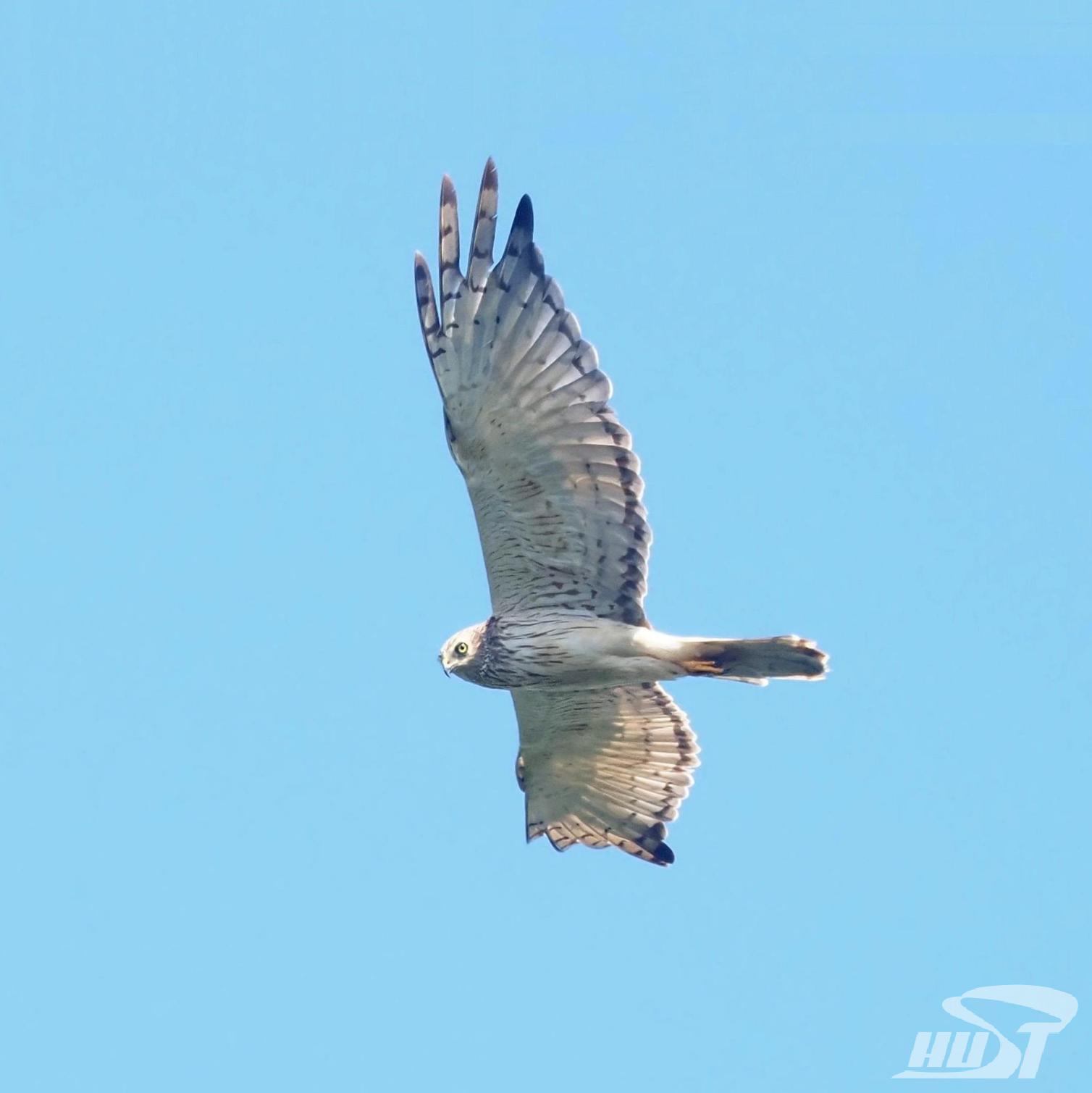 白腹鹞体长50厘米,双翼窄长,尾长,5枚突出的指叉,体色多变,常见色型的雄鸟头部黑灰色,翼下飞羽色浅,可见淡色横斑;胸腹色浅,具不甚明显的黄褐色纵纹;雌鸟整体棕色,初级飞羽色浅斑纹不明显,胸部白色有纵纹;腹部棕色。喻家山迁徙猛禽中,白腹鹞的数量不多,较难见到。