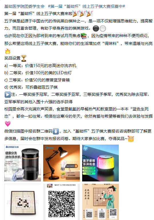 11月29日,基础医学院学生会文体活动部组织开展第一届“基础杯”线上五子棋大赛,活动一上线就获得同学们的广泛关注,目前报名人数已经超过120人。希望这场线上五子棋大赛,驱散同学们因考试月紧张备考带来的焦虑,和疫情期间种种不便造成的烦闷,给同学们的生活增加点“调味料”,带来温暖与光亮。