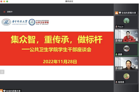 新闻网讯(通讯员 康鹏)为及时了解学生发展现状,倾听学生心声,更好地服务学生成长成才,进一步提高公卫人才培养质量。11月28日晚,公卫学院在线上召开“集众智,重传承,做标杆”全体学生干部座谈会,学院党委书记邱勇、院长潘安、院党委副书记冯霞、副院长郭欢、常江,学办主任周丹、全体辅导员以及学院全体学生干部120余人参会,会议由学院团委书记康鹏主持。