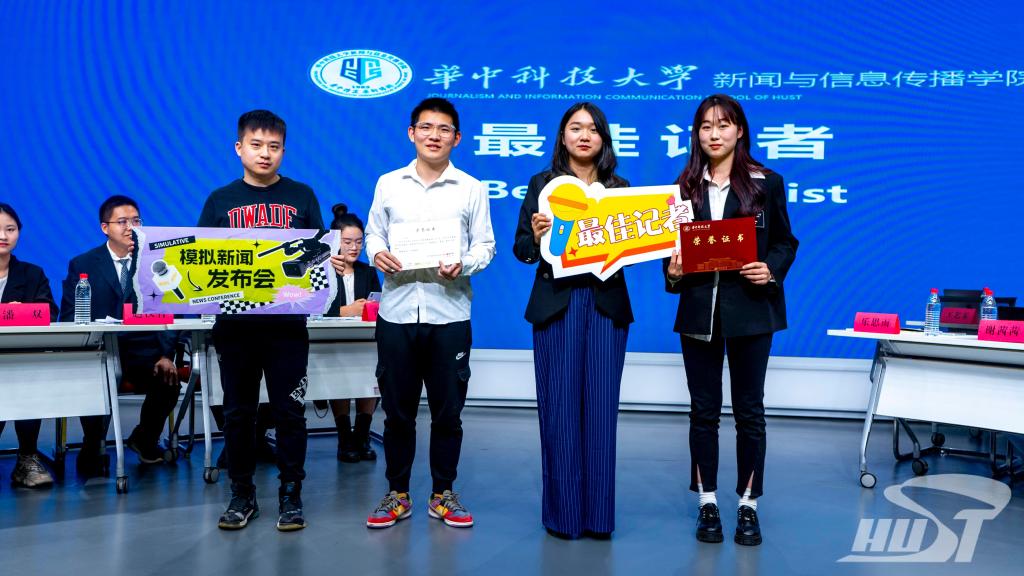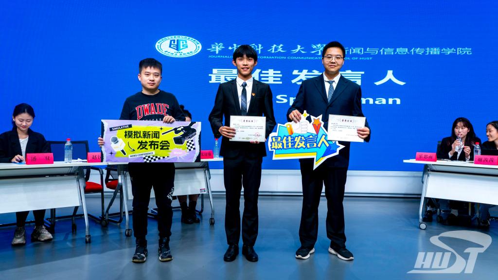 新闻学院辅导员邵蔚楠从青年就业议题谈起,对参赛选手们的临场反应及抗压能力作出了高度评价,并为获奖选手颁发奖状。赵汉青、颜瑞华获得“最佳发言人”称号;新闻学院2022级硕士研究生乐思雨、土木与水利工程学院2022级硕士研究生卢雨、新闻学院2022级本科生王艺霏获得“最佳记者”称号。