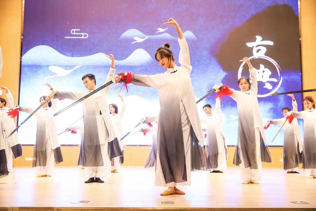 一曲刚劲的旋律响起,艺术实践课《中国古典舞剑舞基础训练》展示了这学期研习的剑舞组合《点剑、撩剑、持剑》。在授课教师胡景博的指导下,同学们以挺拔的身姿和干净利落的动作,好似再现刀光剑影却又荡气回肠的武侠世界。