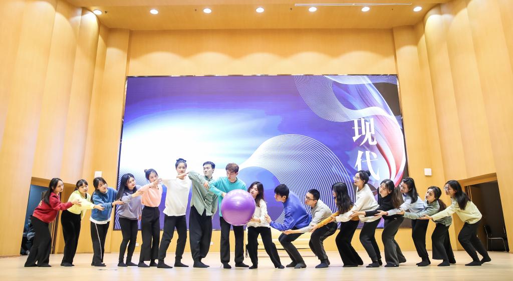 艺术实践课《现代舞:身体感知与创造》(56班)的同学们则展示了他们带来的原创作品《流动的关系》。这部作品借助道具气球,配合肢体语言的展示,阐释了当代社会人与人之间的关系何以流动。