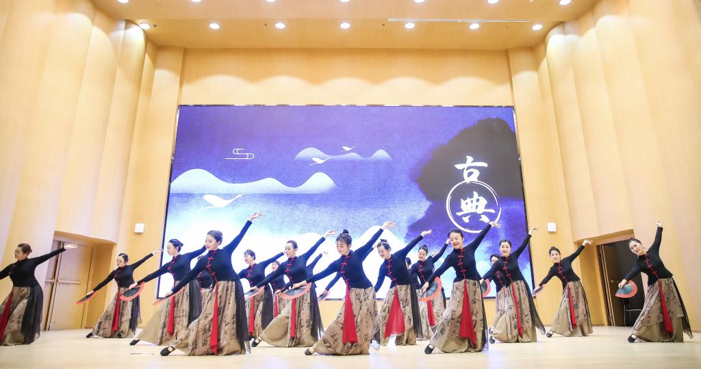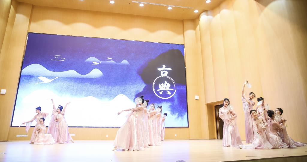 艺术实践课《中国古典舞剧目体验》(教工班)的学员展示剧目《水瑶扇影》。往日站在讲坛上的他们,此刻穿着颇具古典韵味的舞服,在舞台上随着旋律而变换着舞步,尽情书写着他们对中国古典舞的理解与热情。