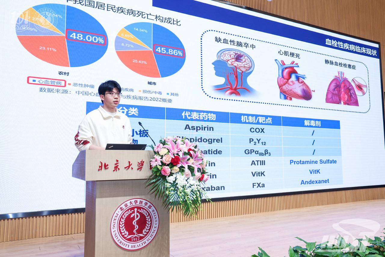 在论坛口头报告中,来自基础医学(强基)2001班的李必成同学立足于研究目的、方法、结果、结论四个维度,运用精彩的图表向评委及全场听众展示了团队基于新型抗血栓靶点PDI的药理学探索。最终取得了口头报告二等奖的好成绩(第4名)。