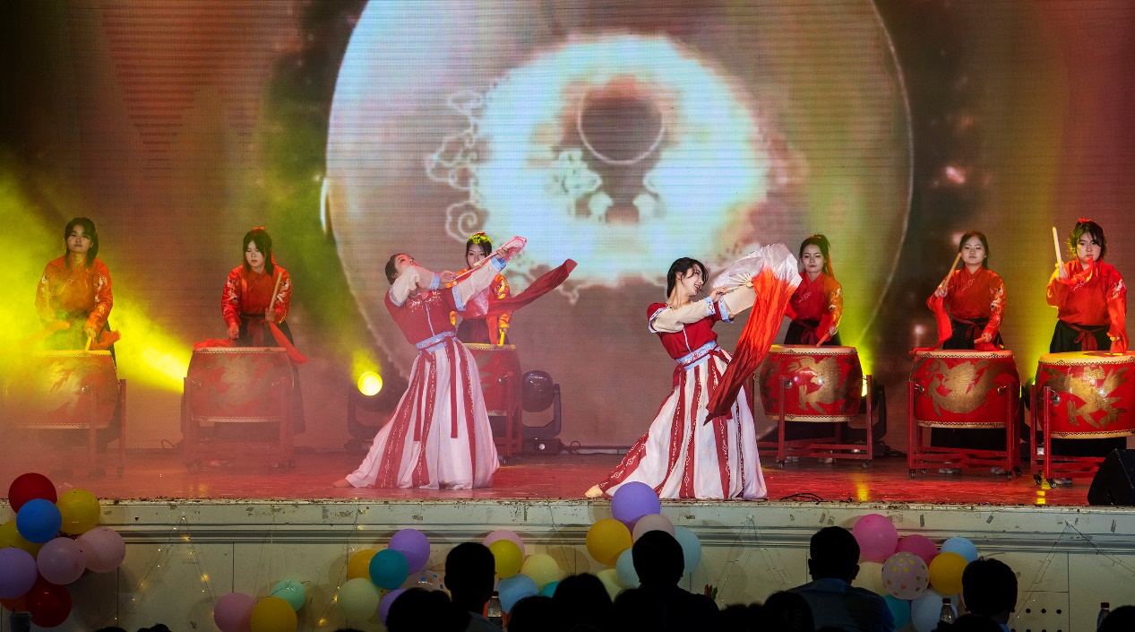 春雷乍响、金鼓喧嚣,在气势磅礴的阵阵鼓声中,23级本科生为大家带来器乐舞蹈《骁》,舞者们带大家走入“一箫一剑走江湖,千古情愁酒一壶。两脚踏翻尘世路,以天为盖地为庐 ”的少年豪情,展现了中华民族不屈不挠的精神。
