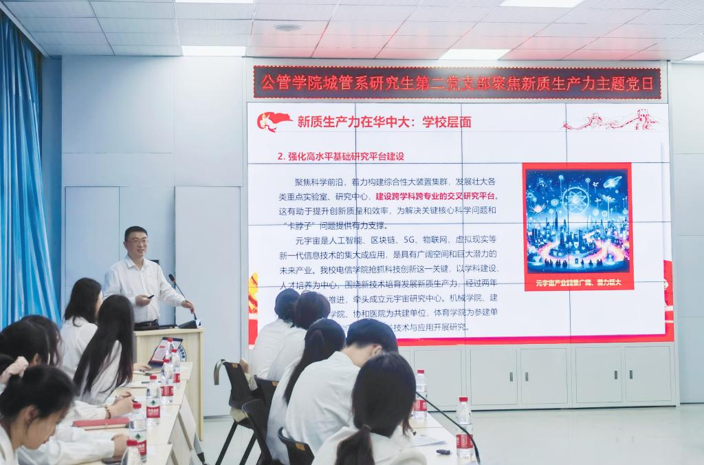 结合科研与实践经历,与会党员展开充分交流。博士生党员李思齐认为数据要素对推动新质生产力发展具有重要作用。硕士生党员邓垚分享了大数据技术对其科研产生的积极影响。硕士生党员丁子杰认为公管学子要不断提升信息素养,以适应新质生产力的发展要求。