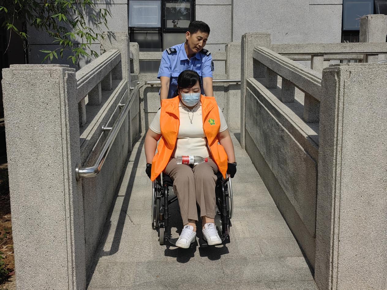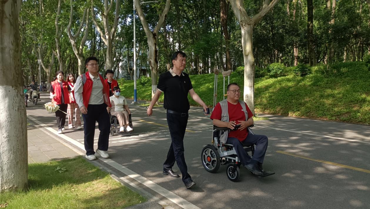 大学生志愿者与残障人士一一结对,自南大门开始,途经校图书馆、校医院、百景园食堂,在游览校园的同时体验校内生活环境无障碍设施。