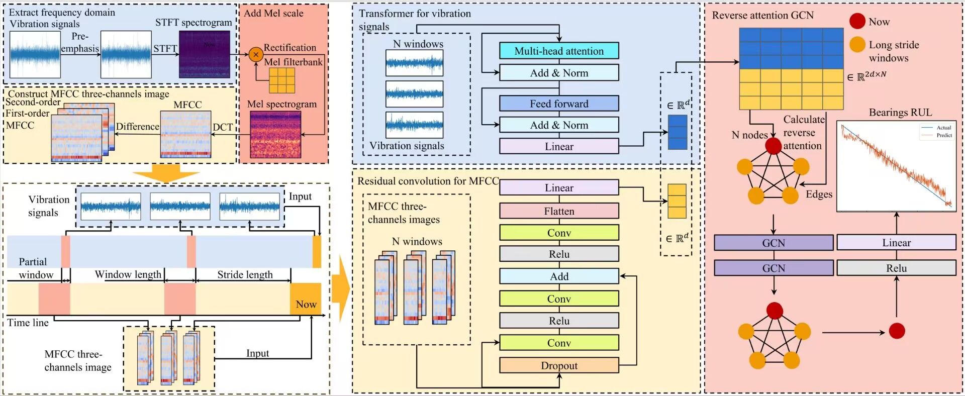 轴承是机械设备中的关键部件,轴承的剩余使用寿命(RUL)预测对工业生产具有重要意义。现有的轴承RUL预测方法广泛利用振动信号的时频图和长期依赖性,其中时频图的线性频率尺度特性不利于低频特征缺陷和高频固有振动的表征,而轴承的突变振动对长期依赖性干扰严重。针对上述问题,研究团队引入了梅尔尺度频率倒谱系数(MFCC),通过对数尺度优化频率区域;同时提出了新型网络架构RCT-RAGCN,基于反向注意机制改进了长期依赖的聚合方法,减轻了轴承状态突变的干扰,从信号差异的角度解决了长期依赖问题。与已知的本领域先进方法进行对比,研究团队所提出的方法在多个公开数据集上获得了最佳的准确性。