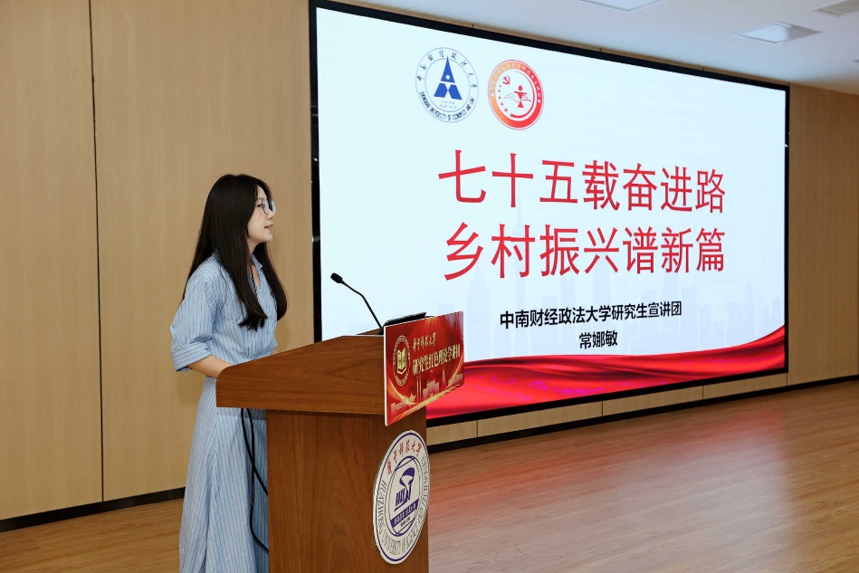 中南财经政法大学研究生宣讲团常娜敏以《七十五载奋进路,乡村振兴谱新篇》为题,聚焦乡村振兴,围绕甘肃省民勤县治沙事业中的青年鲜活故事,勉励广大青年将火热的青春投入国家乡村振兴事业。
