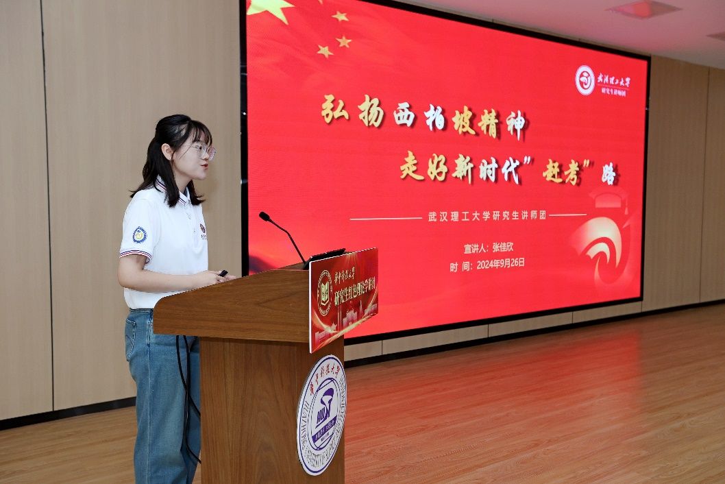 武汉理工大学研究生讲师团张佳欣以《弘扬西柏坡精神,走好新时代“赶考”路》为题,带领听众走进闪耀在革命史册的一颗璀璨明珠——西柏坡,携手走进历史殿堂,与听众一起领略巍巍柏坡岭,见证赶考初心。