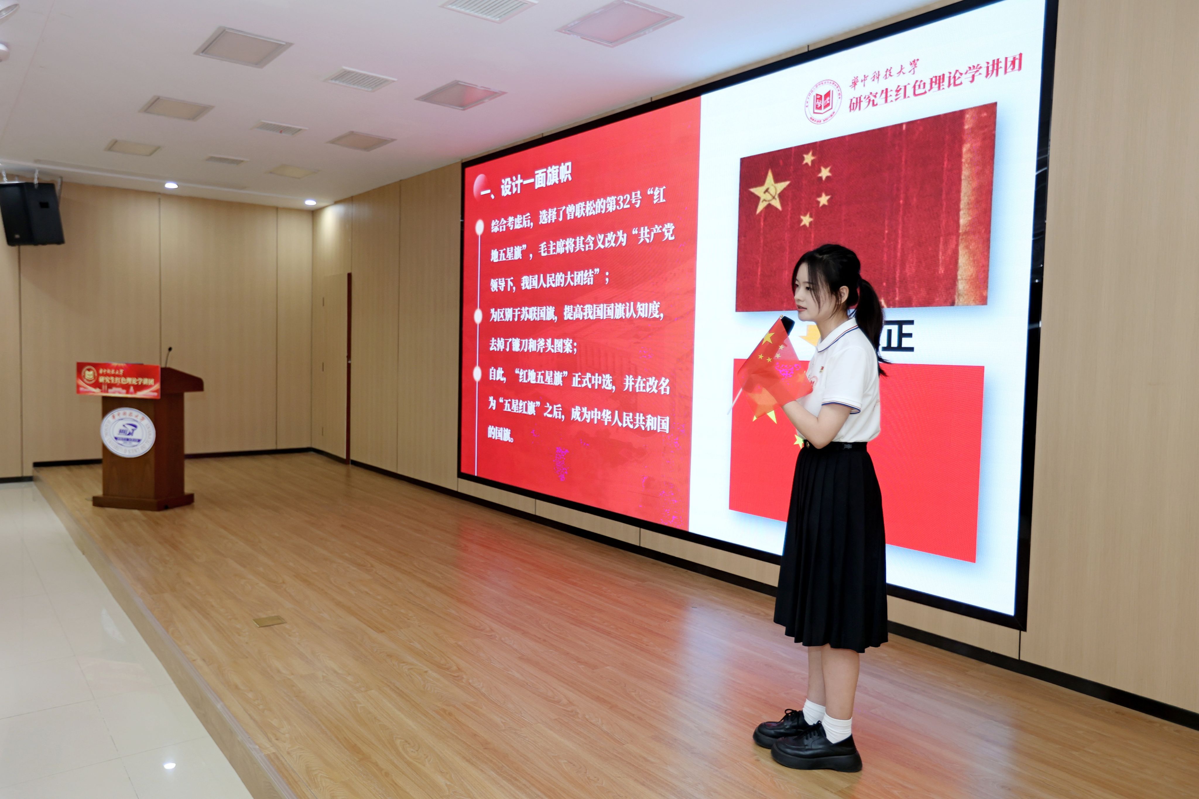 我校研究生红色理论学讲团郭蓝羽以《五星红旗迎风飘扬——新中国成立的历史瞬间》,从“设计一面旗帜”“升起一面旗帜”“想象一面旗帜”“感悟一面旗帜”等方面,带领听众从旗帜中汲取爱国爱党的家国情怀和兢兢业业的奋斗精神。
