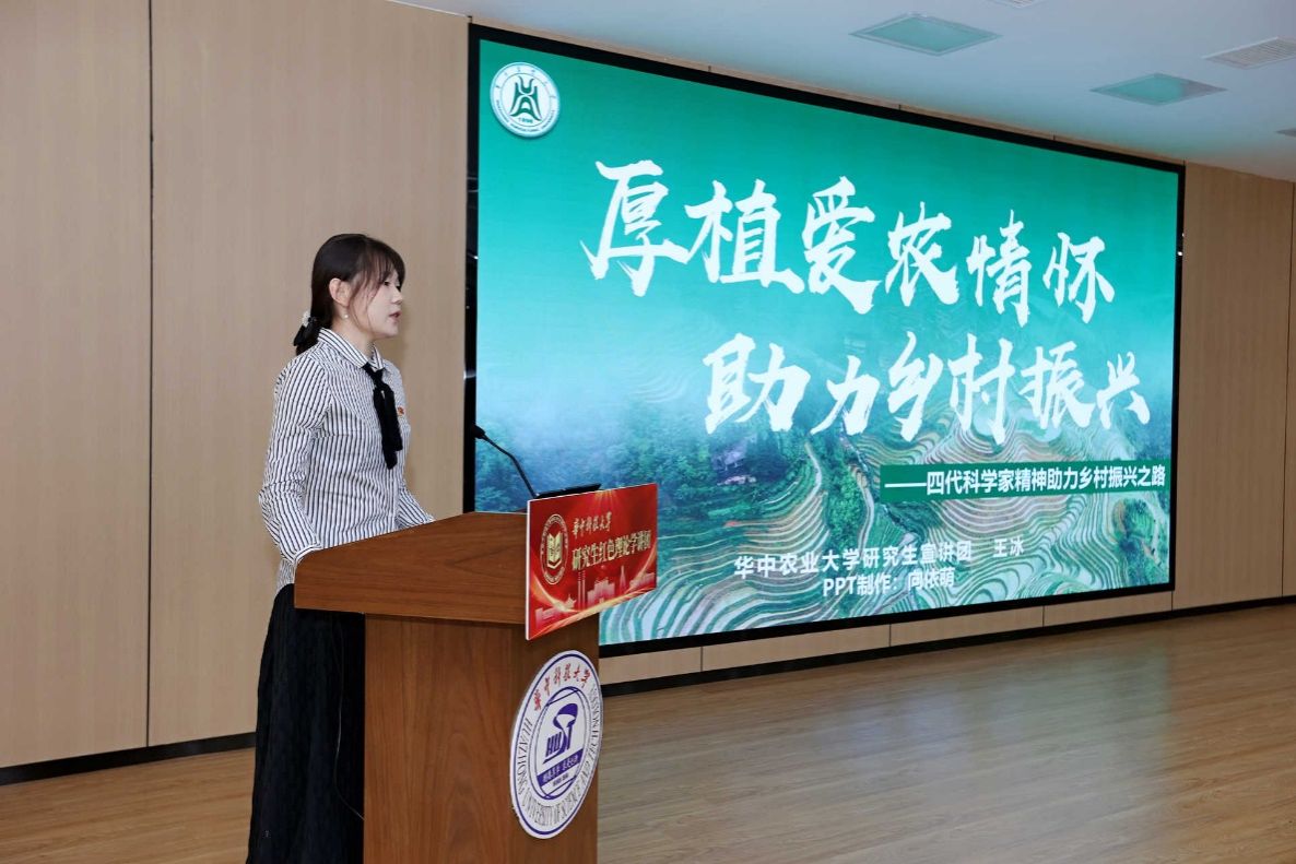 华中农业大学研究生宣讲团讲师王冰以《厚植爱农情怀,助力乡村振兴》为题,从“一棵树”讲起,以华中农业大学四代科学家精神诠释厚植爱农情怀的时代意义。