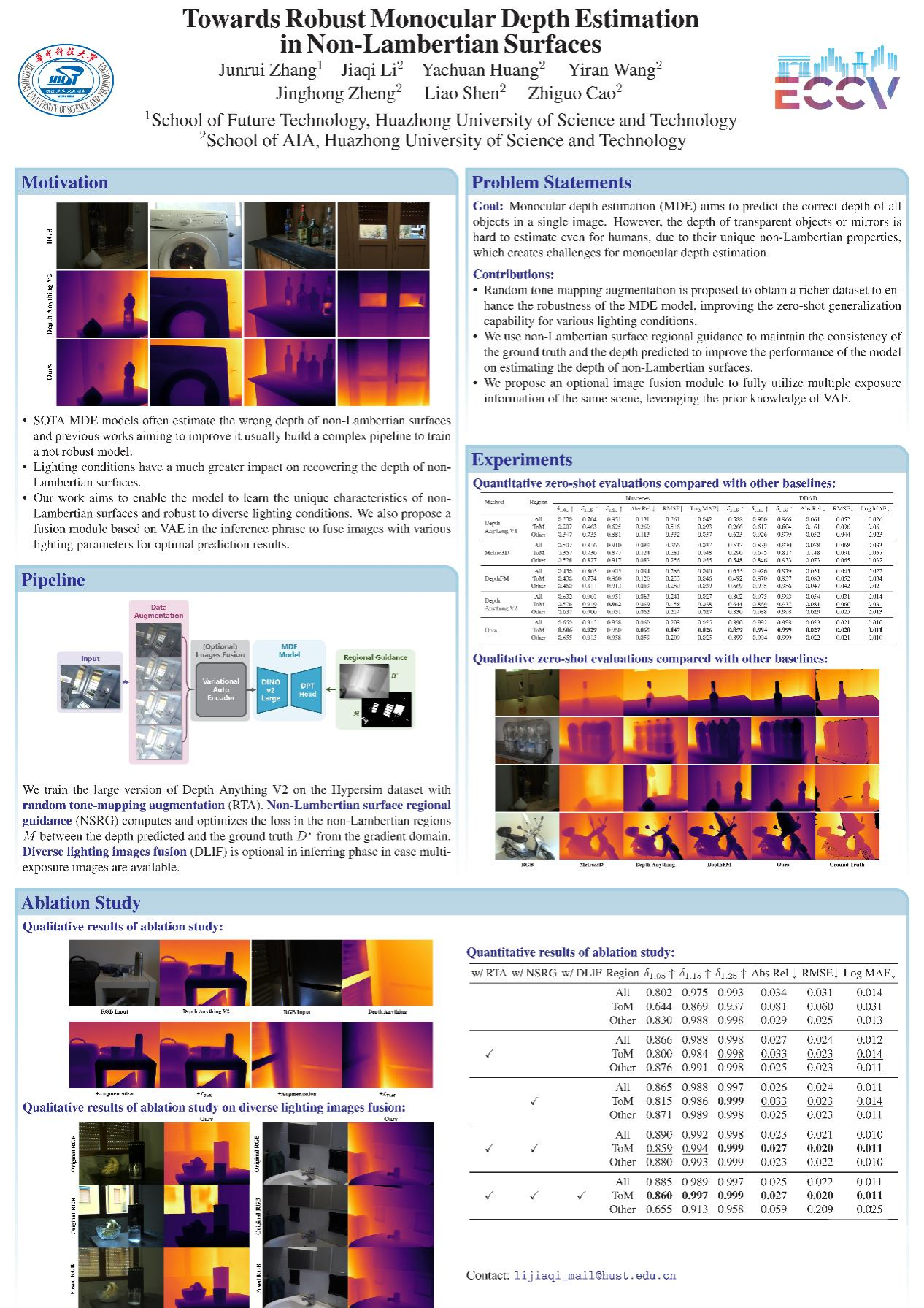 张峻瑞与人工智能与自动化学院的研究生黎家骐、黄亚川等在曹治国教授指导下,针对非朗伯表面的深度估计挑战提出了三点改进。首先,考虑到相比于朗伯体,光照对于非朗伯体的成像具有更显著的影响,论文使用随机色调映射等数据增强手段提升深度预测模型对于不同光照条件下非朗伯体的预测鲁棒性;其次,作者发现利用区域语义引导的损失函数可以使深度预测模型直接学习到非朗伯表面的特殊几何特征,使整体框架不再像此前工作一样严重依赖于模型输入侧基于超参的图像编辑,从而达到更好的性能;最后,在多重曝光图像可用的情况下,论文还提出了一个新颖的基于变分自编码器的图像融合模块,利用多张不同曝光条件的图像合成出一张对非朗伯体深度估计最为有利的输入图像。实验结果表明,论文提出的方法在多种场景中表现卓越,其深度估计结果比基准模型ZoeDepth和其他参赛团队的模型更接近于真实的深度图(GT)。无论在光照变化或其他复杂环境下,其预测结果均显现出更高的准确性和稳定性,尤其在基于非朗伯表面的定量指标上全面超越参赛其他团队,最终摘得比赛桂冠。