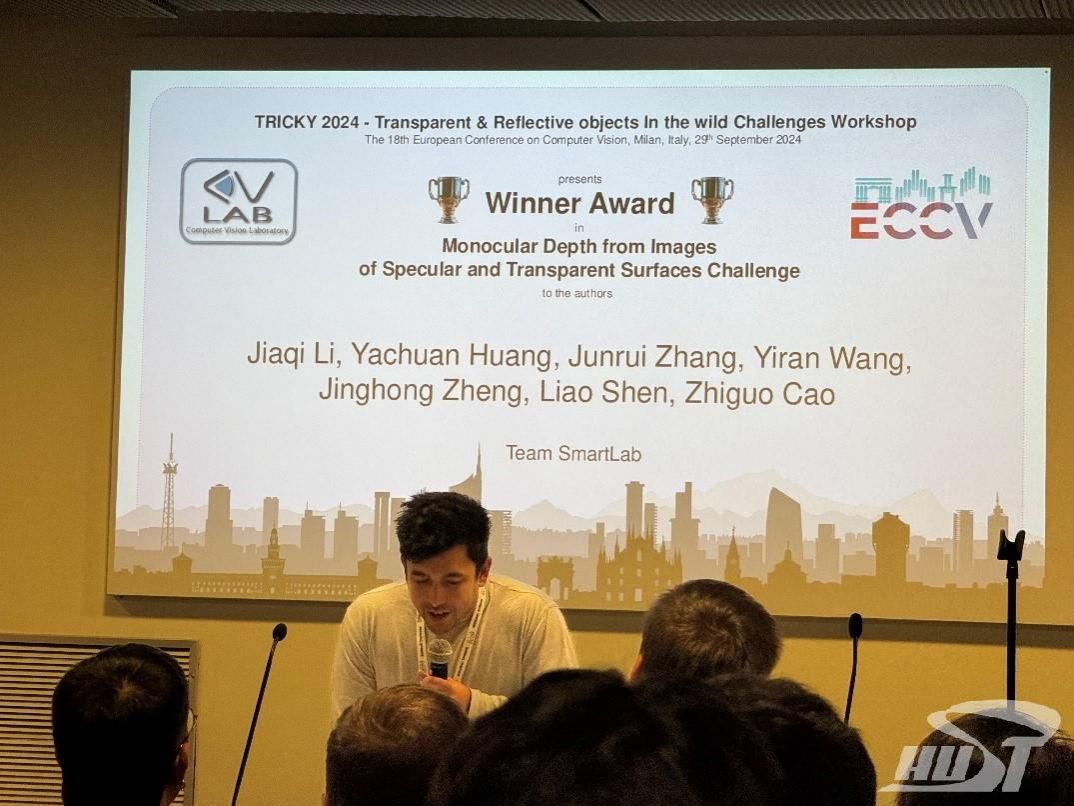新闻网讯 9月29日,欧洲计算机视觉会议(ECCV2024)在意大利米兰召开。大会组织的“TRICKY 2024:Transparent & Reflective objects In the wild Challenge (自然场景透明和反射物体挑战赛)”的“Monocular Depth from Images of Specular and Transparent Surfaces Challenge (镜面和透明表面图像的单目深度估计)” 赛道比赛结果揭晓,我校未来技术学院2021级本科生张峻瑞参与的竞赛团队(Smartlab)获得全球冠军。张峻瑞以第一作者的身份撰写了学术论文“Towards Robust Monocular Depth Estimation in Non-Lambertian Surfaces”介绍参赛项目,并受邀在大会Workshop上进行论文学术交流。