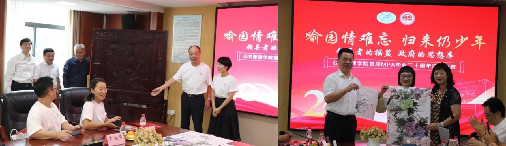 新闻网讯(通讯员 杜微)10月5日,以“喻园情难忘,归来仍少年”为主题,公共管理学院首届公共管理硕士(MPA)毕业二十周年重返校园系列活动举行。近30位校友齐聚母校,共叙同窗情、重拾青春梦。公共管理学院原院长徐晓林,湖北大学校长、我校公共管理学院原副院长刘建平,我校公共管理学院党委书记刘芳、院长张毅以及教师代表王国华、毛羽、孙春霞等参加活动。