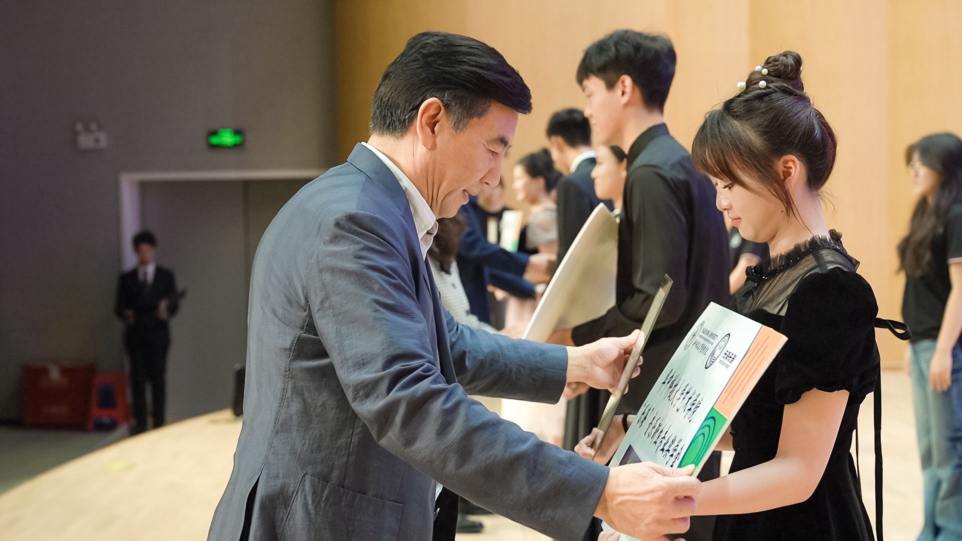 艺术学院党委书记赵根成主持颁奖仪式。他表示,近期艺术学院与乐海乐器有限公司签署了校外实习实践基地共建协议,迈入校企合作新篇章。他希望通过合作,进一步加强高校与企业之间的资源共享和优势互补,为民族乐器产业注入更多创新活力。