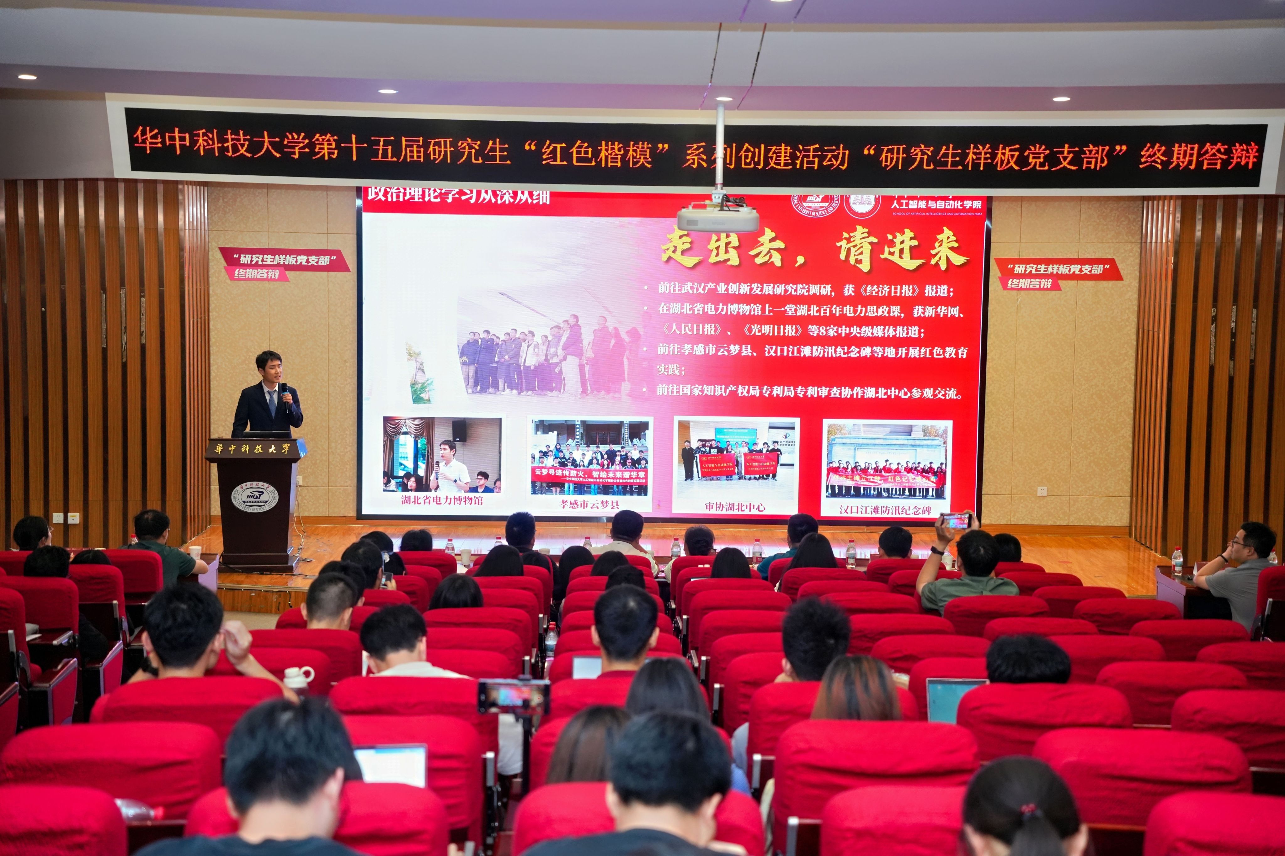 在研究生党员标兵答辩现场,25位候选人通过“小故事”讲述“大情怀”,展现党员先锋模范带头作用。马克思主义学院硕士生赵羡文致力于研究生红色理论学讲团建设,深入党支部、社区、企业开展理论宣讲80余场,覆盖7000余人次;机械学院博士生丁涛参研“荆楚”人形机器人,成果亮相2025年湖北省新春第一会;材料学院博士生侯明君勇于攻关高端装备金属构件数智化成形核心难题,研究成果应用于多个高端装备核心部件。他们积极当好党的创新理论传播者、科技报国主力军、服务社会带头人、青年学生领头雁,用实际行动践行着“强国有我”的青春誓言。